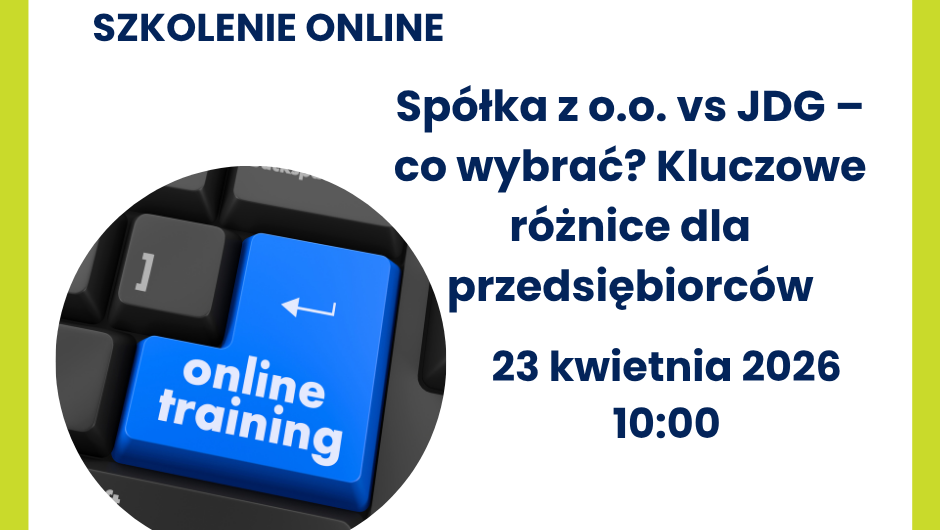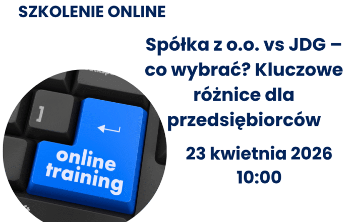 Szkolenie online „Spółka z o.o. a JDG – różnice w obciążeniach podatkowych i składkowych, porównanie kwestii odpowiedzialności oraz różnice w praktycznych aspektach prowadzenia działalności gospodarczej.” Stowarzyszenie Inicjatyw Gospodarczych inGO we współpracy z [...]
